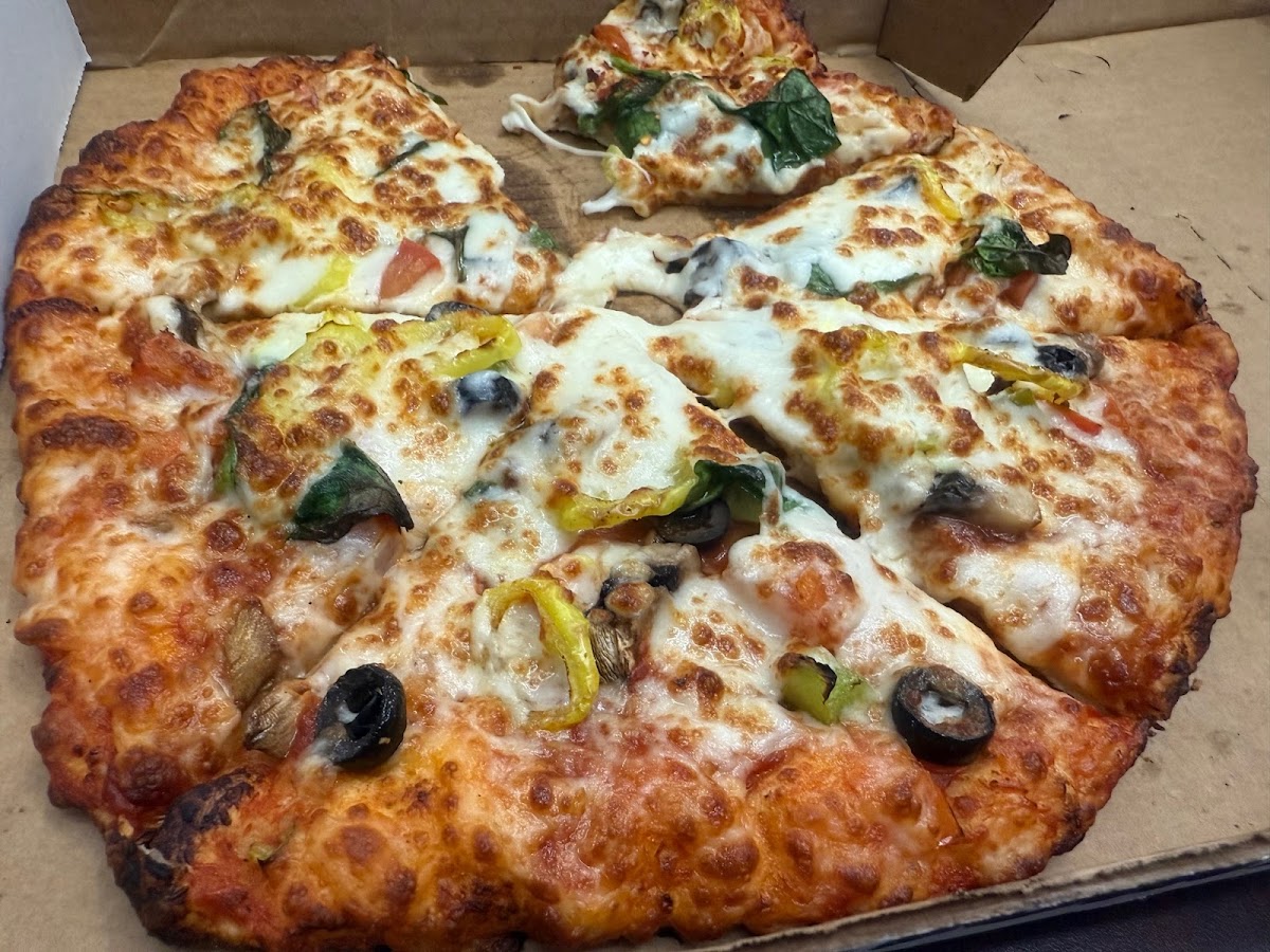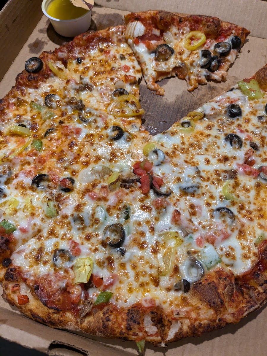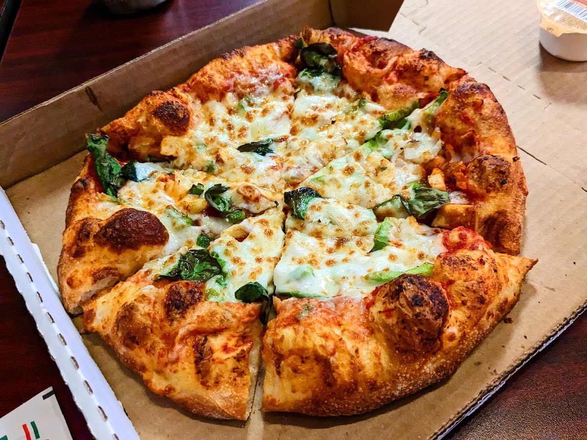 I couldn’t wait to try, apologies for the incomplete pie. This pizza was awesome. The white sauce and cook was perfect. Many places claim to have a good garlic sauce for pizza, but nothing I’ve had comes close to this. I originally ordered the pizza with ricotta, but after taking a bite, I want even mad they forgot the ricotta. This will definitely be my go to spot for pizza from now on. The atmosphere was fine, and the persons working there were extremely helpful.