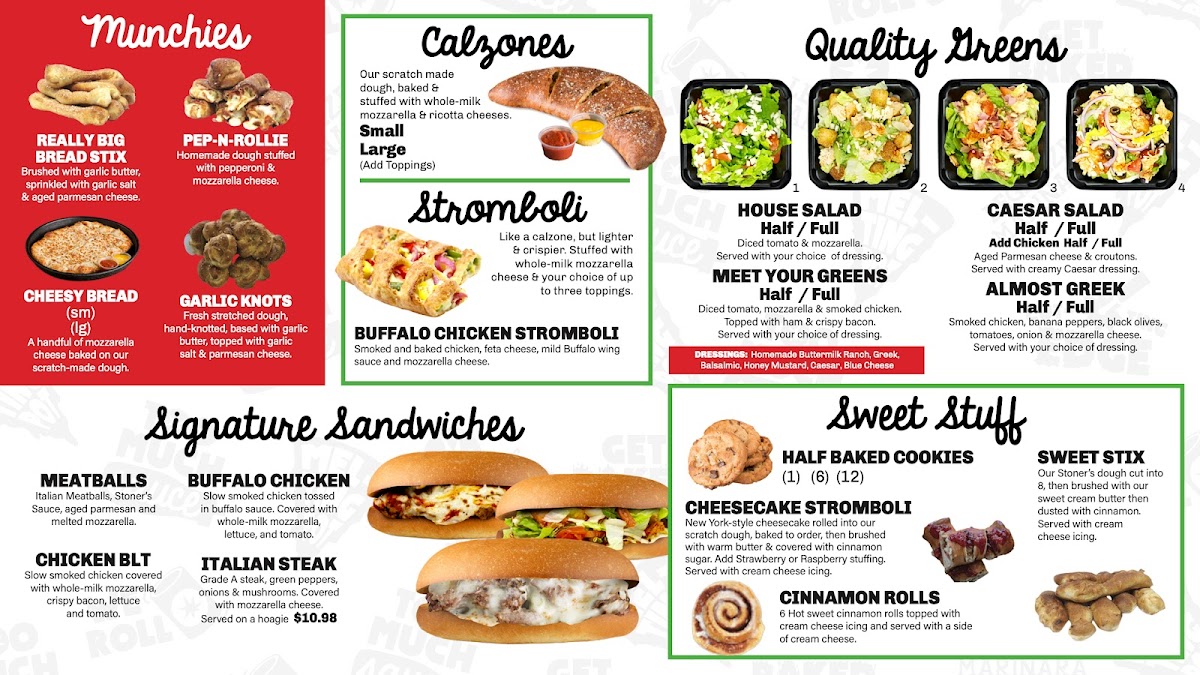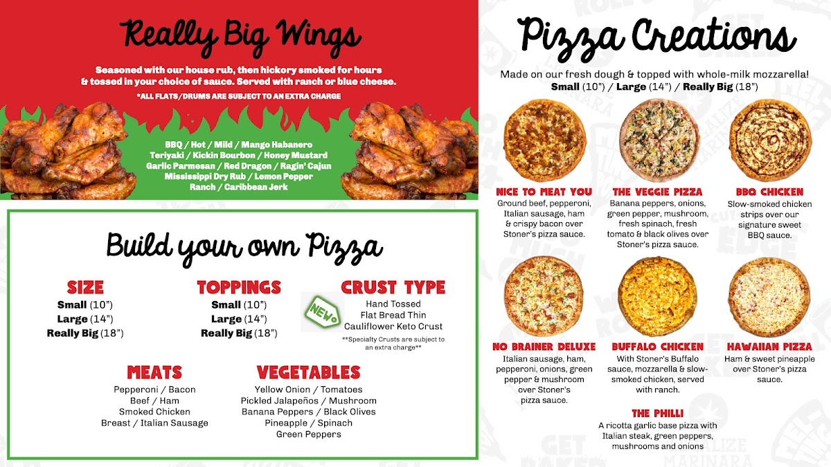 Stoner’s Pizza Joint offers a straightforward and approachable menu centered around classic and creative pizza options. The style is casual and unpretentious, making it an easy choice for grabbing a satisfying slice or a full pie with friends or family. Alongside their signature pizzas, you’ll find comforting staples like hearty calzones, flavorful strombolis, and shareable chicken wings, all served in a relaxed, no-fuss environment.